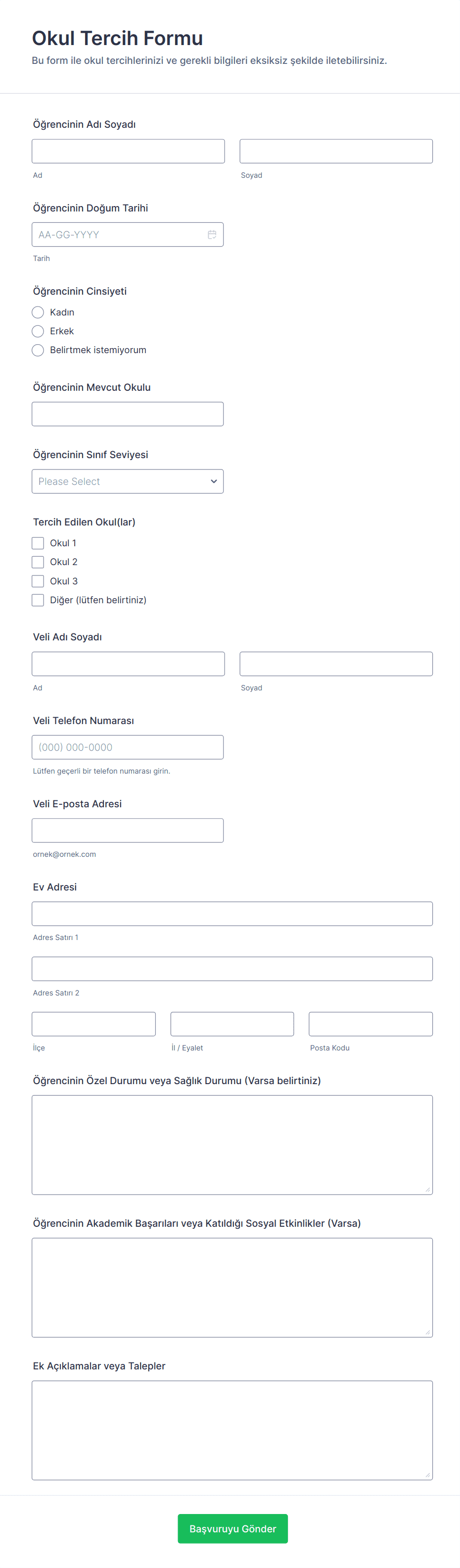 Bu adımları takip ederek, veri toplama sürecini kolaylaştıran, idari iş yükünü azaltan ve hem öğrenciler hem de veliler için kayıt deneyimini iyileştiren bir okul kayıt formu oluşturabilirsiniz.