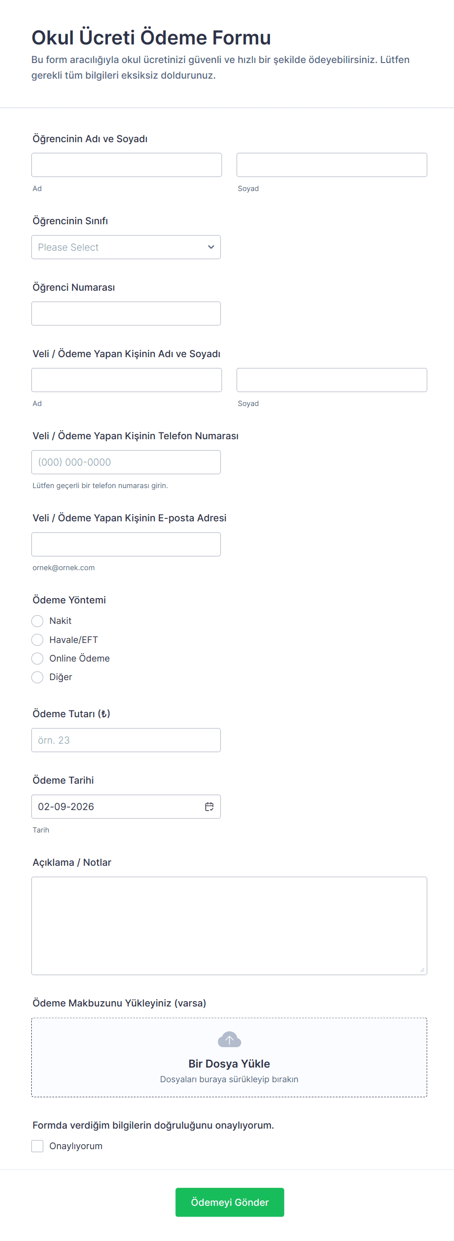 Ödeme formu, entegre ödeme ağ geçitleri aracılığıyla kullanıcılardan ödemeleri, bağışları veya ücretleri güvenli bir şekilde toplamak için tasarlanmış bir online formdur.