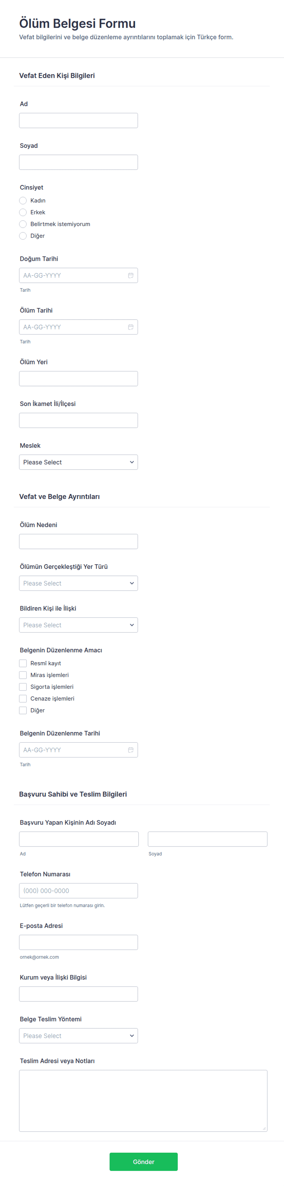 Genel alanlar arasında kişisel bilgiler, beyan ifadesi, onay için işaret kutuları, e-imza alanları ve gönderim tarihi bulunur. Özel kullanım durumuna göre ek alanlar eklenebilir.