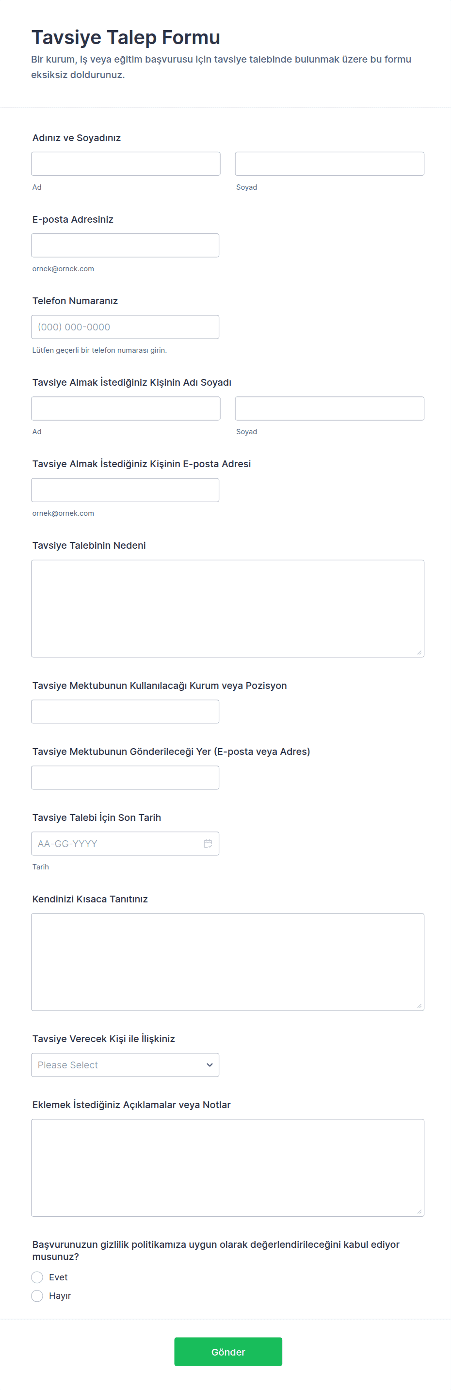 Tavsiye Talep Formu, referans mektubu taleplerini tek yerde toplayıp son tarih ve teslim ayrıntılarını netleştirerek öğrenciler, adaylar ve ekiplerin süreci daha kolay yönetmesine yardımcı olur.