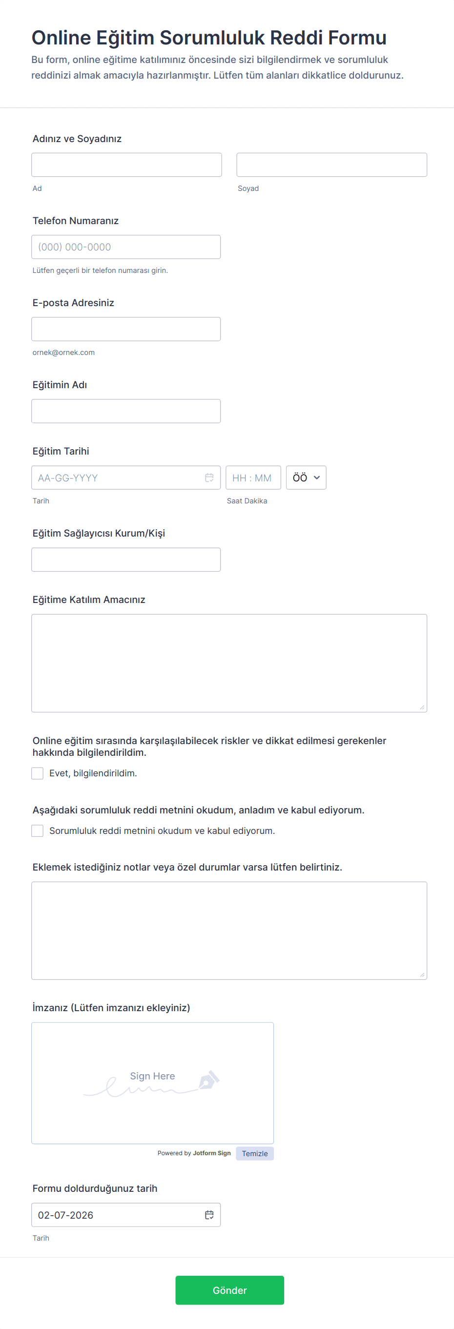 Online Eğitim Sorumluluk Reddi Formu, çevrim içi eğitim ve atölyelerde katılımcı onayını almanıza ve veri toplama sürecini düzenlemenize yardımcı olan bir Jotform form şablonudur.