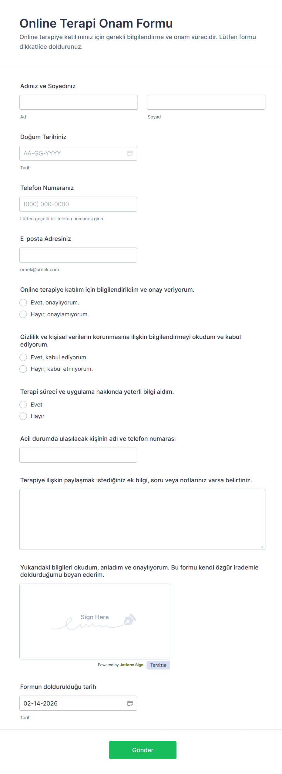 Jotform ile onay formları oluşturmak ve yönetmek sorunsuz bir süreç haline gelir. Jotform'un kodlama gerektirmeyen Form Oluşturucu'su, kullanıcıların hasta kabulü, ebeveyn izinleri veya veri işleme sözleşmeleri gibi özel ihtiyaçlarına yönelik onay formlarını hızlıca tasarlamalarına olanak tanır. Sürükle-bırak arayüzü, özelleştirilebilir şablonlar ve güvenli depolama ve bildirim sistemleriyle entegrasyon, onay yanıtlarını toplamayı, düzenlemeyi ve erişmeyi kolaylaştırır. Kullanıcılar, Jotform'un gelişmiş özelliklerini kullanarak uyumluluğu sağlayabilir, iş akışlarını düzenleyebilir ve hem kuruluşlar hem de yanıtlayanlar için profesyonel bir deneyim sunabilir.