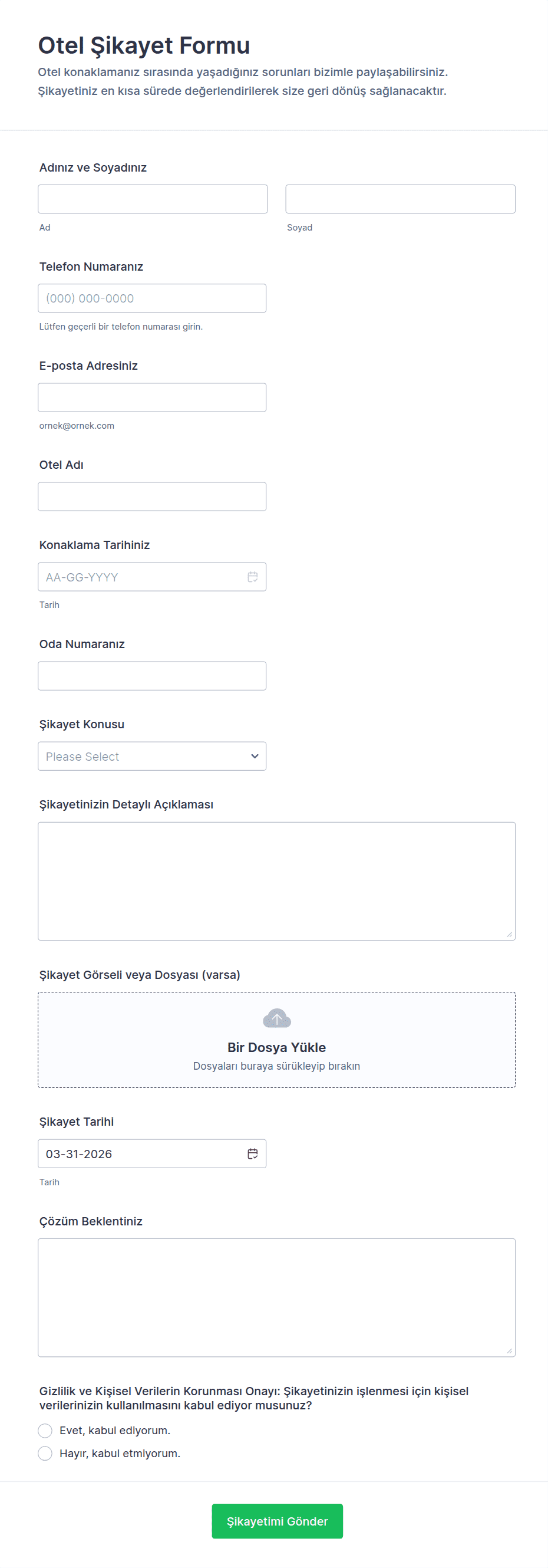 - Koşullu Mantık: Belirli alanlar yalnızca belirli seçenekler seçildiğinde görünebilir (örn. şikayet türü).