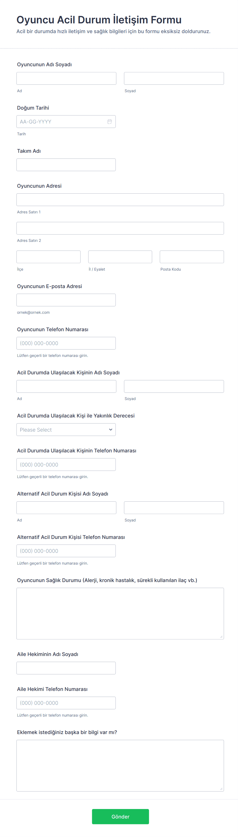 Acil Durum İrtibat Formları, acil bir durumda hızlıca erişilebilecek kritik iletişim bilgilerini toplamak ve saklamak için kullanılan önemli belgelerdir. Bu formlar, acil bir durum ortaya çıktığında aile üyeleri, vasiler veya belirlenmiş kişilerle iletişime geçmek için güncel bilgilere sahip olmak amacıyla okullar, iş yerleri, spor takımları, sağlık hizmeti sağlayıcıları, yaz kampları ve etkinlik organizatörleri tarafından yaygın olarak kullanılır. Tipik kullanım alanları arasında öğrenci kaydı, işe alım, hasta kabulü, gönüllü kaydı ve seyahat programları yer alır. Acil durum iletişim bilgilerini toplayarak kuruluşlar, kazalar, tıbbi olaylar veya diğer beklenmedik durumlar sırasında gözetimlerindeki kişilerin refahını korumaya yardımcı olmak için hızlı ve uygun şekilde müdahale edebilir.