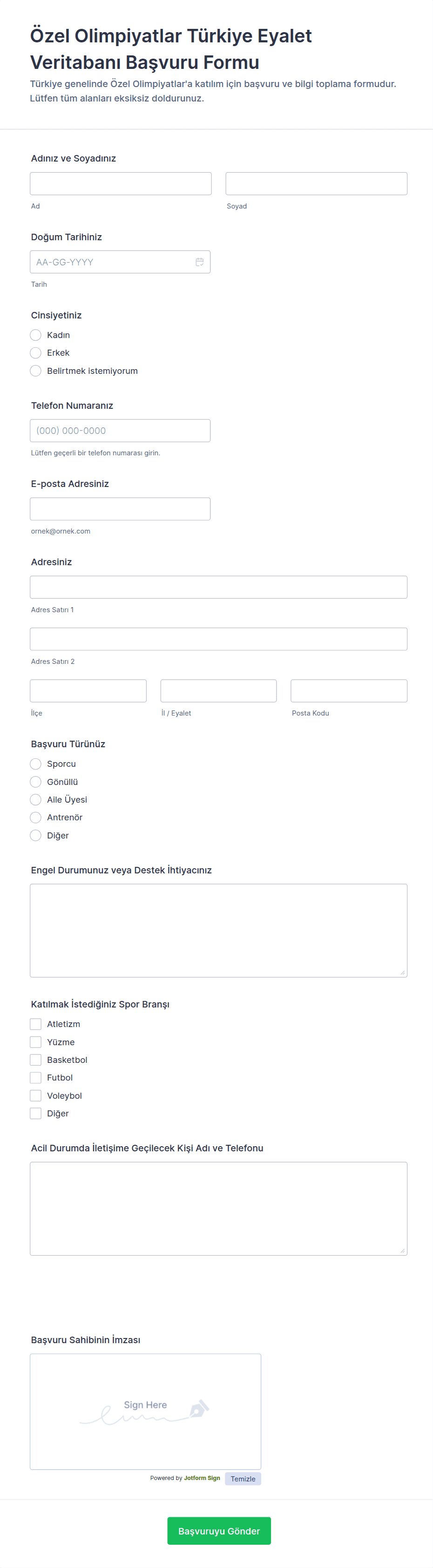 Özel Olimpiyatlar Türkiye Eyalet Veritabanı Başvuru Formu ile sporcu kayıtlarını tek noktadan toplayın, veri toplama sürecini düzenleyin ve Jotform üzerinden form yanıtlarını kolayca takip edin.