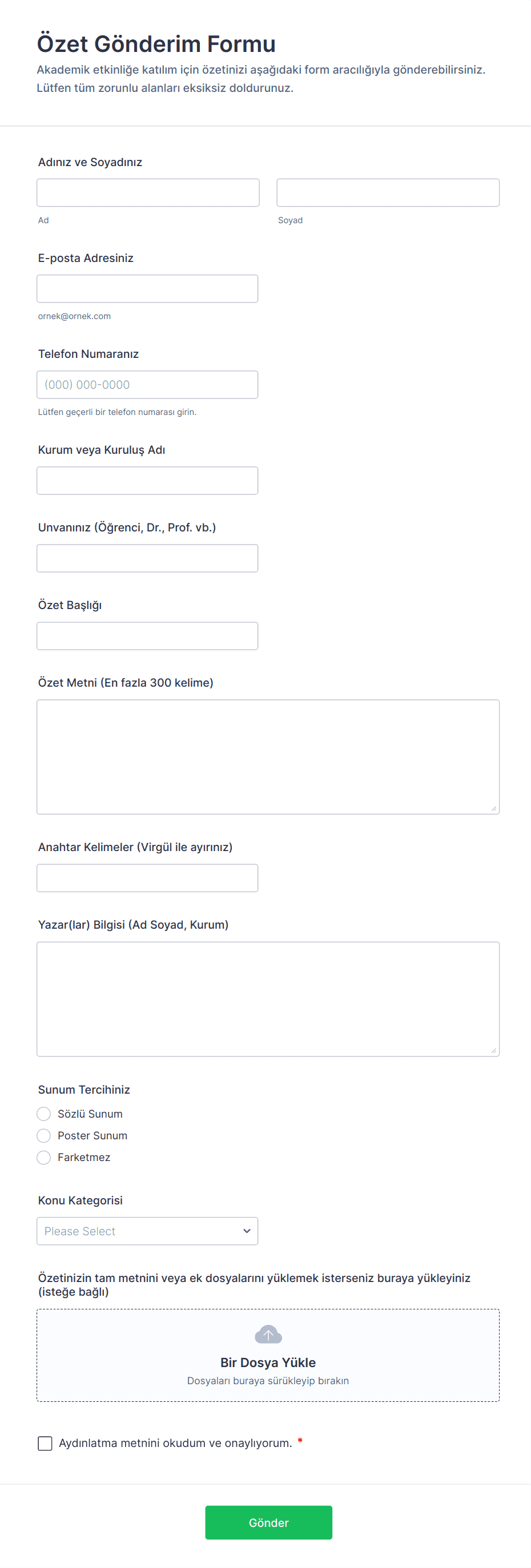 Özet Gönderim Formu, akademik etkinlikler ve bilimsel yayın çağrıları için özetleri online veri toplama ile tek merkezde toplamanıza yardımcı olur ve Jotform ile form yanıtlarını kolayca yönetmenizi sağlar.