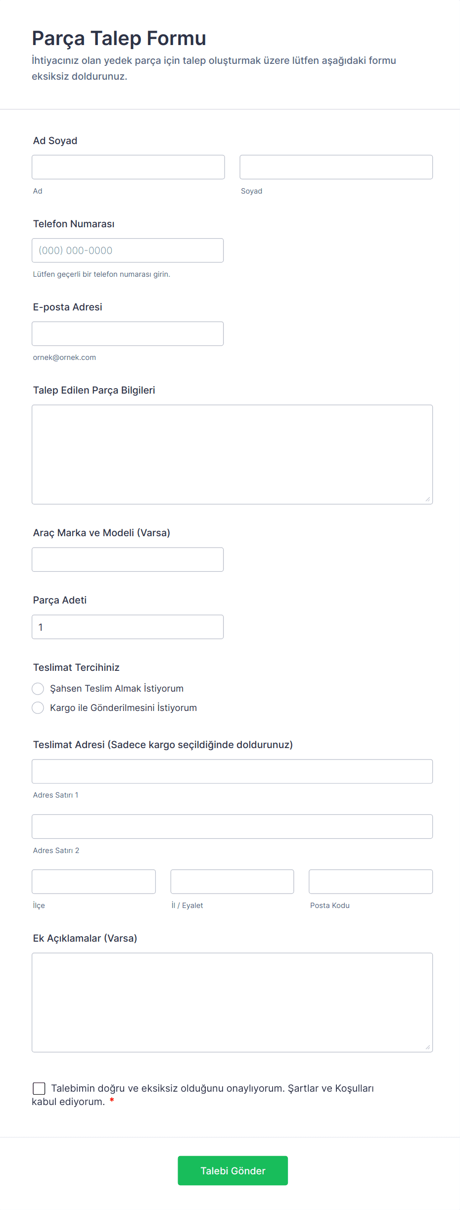 - Teslimat adresi, tercih edilen teslimat tarihi ve tedarikçi bilgileri