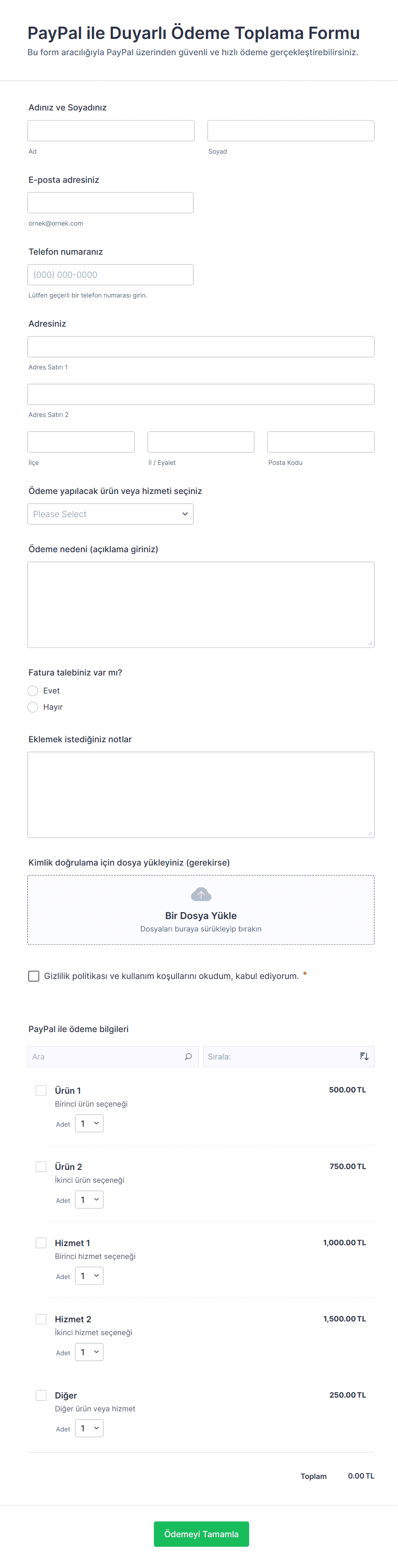 PayPal Ödeme Formu, kullanıcıların PayPal üzerinden doğrudan ödeme, bağış veya ücret toplamasına olanak tanıyan, güvenli ve kullanışlı bir işlem deneyimi sunan bir online formdur.