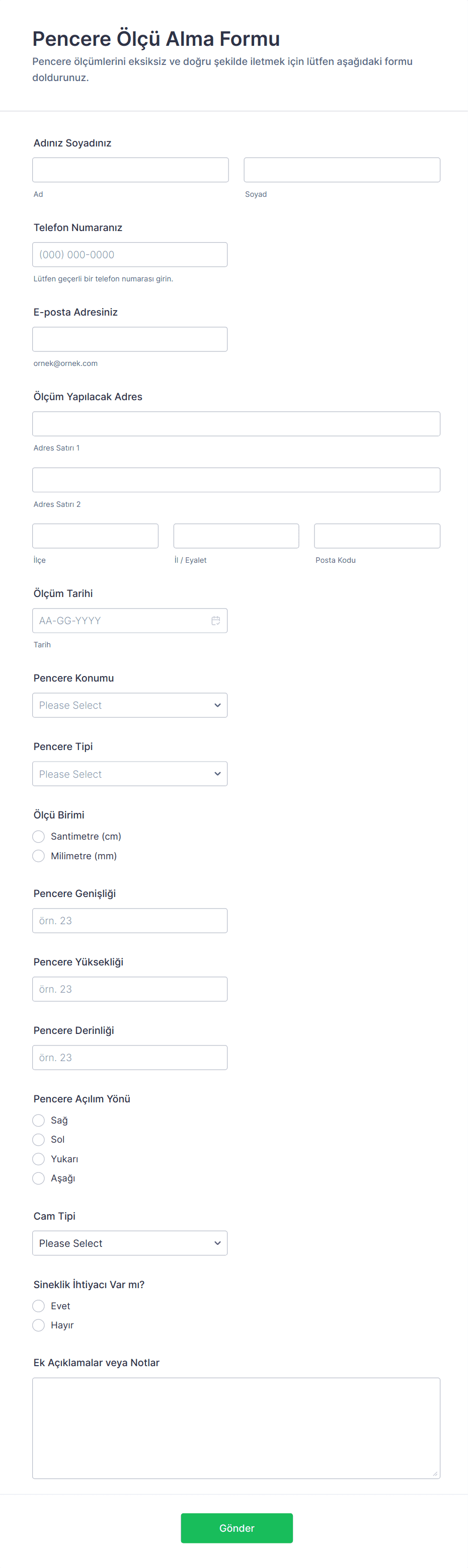 - Miktar veya proje detayları (kısa/uzun metin, sayı alanları)