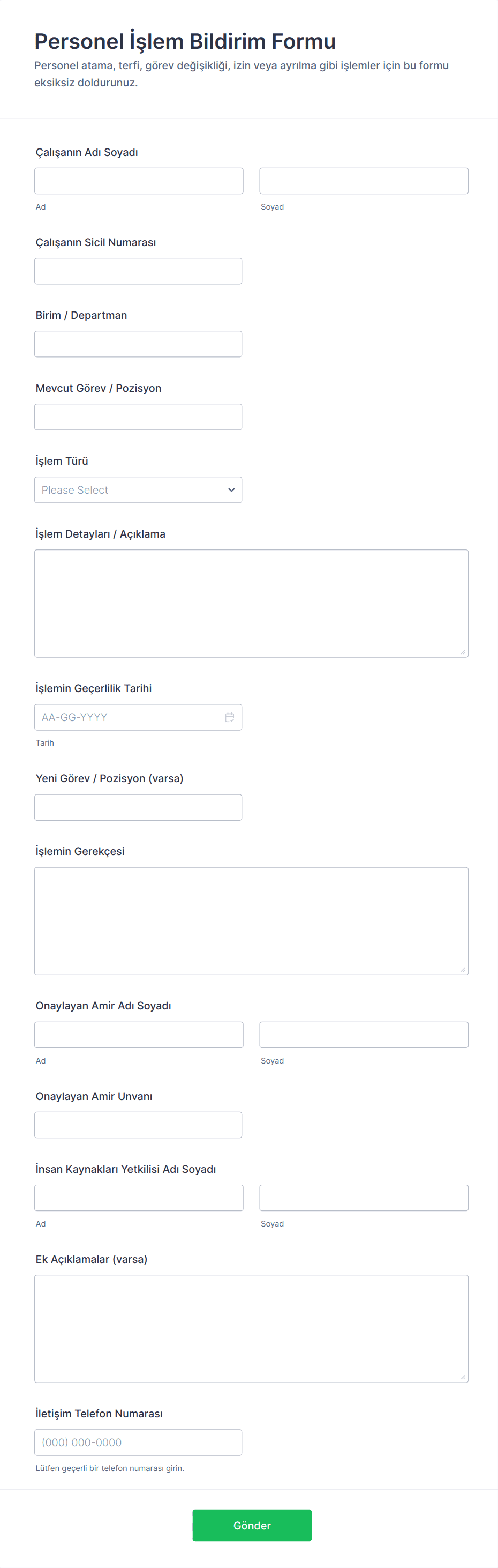 İnsan kaynakları (İK) formları, kuruluşların çalışan bilgilerini ve faaliyetlerini toplamak, takip etmek ve yönetmek için kullandıkları belgelerdir. Bu formlar, işletmelerin ve sivil toplum kuruluşlarının istihdam yasalarına ve yönetmeliklerine uymalarına, çalışan yaşam döngüsünü yönlendirmelerine ve İK departmanı ile çalışanlar arasında etkili iletişim sağlamalarına yardımcı olur.