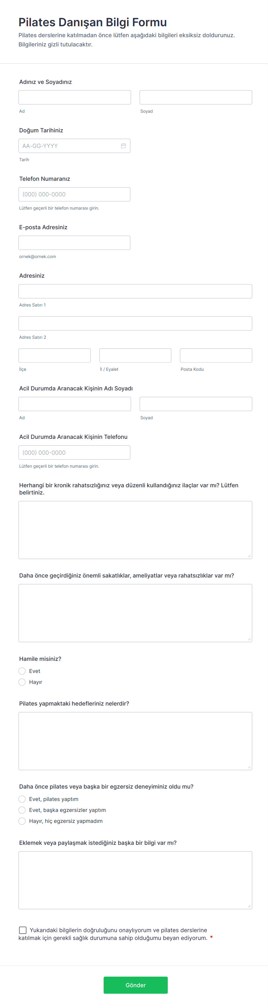 Genel alanlar arasında iletişim bilgileri, sağlık ve tıbbi geçmiş, fitness veya antrenman hedefleri, uygunluk durumu, acil durum iletişim bilgileri ve onay veya feragat sözleşmeleri bulunur.