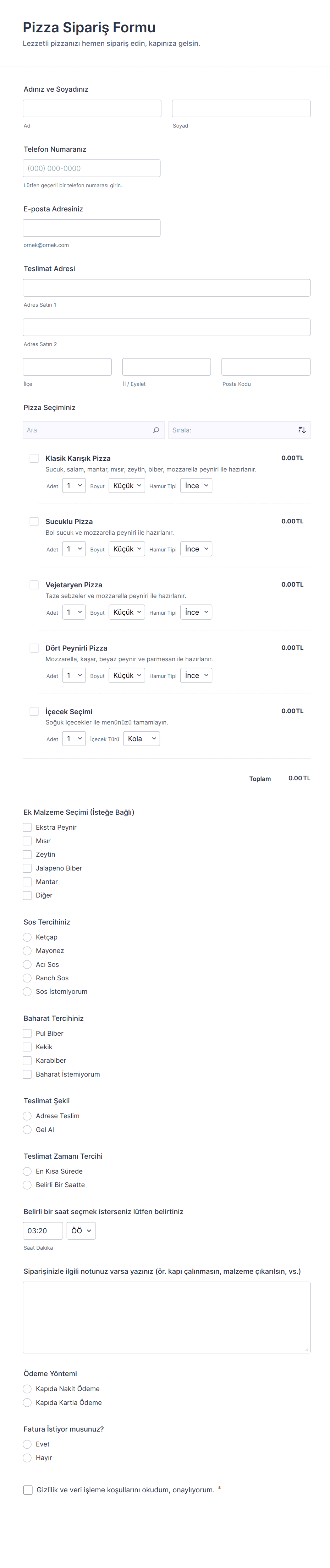 - Restoran Siparişleri: Formlar menü öğesi seçimi, değiştiriciler (örn. boyut, malzemeler), teslimat adresi ve ödeme entegrasyonu içerebilir.