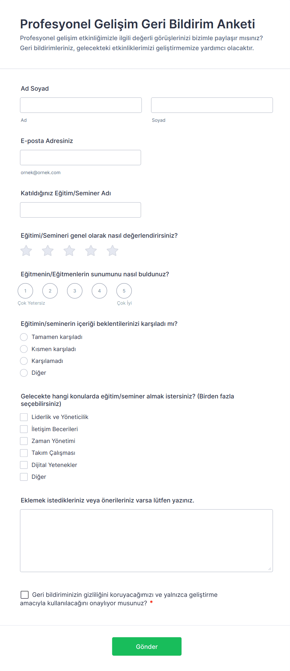 - Eğitim sonrası geri bildirimi için kurs içeriği, sunum ve genel memnuniyet hakkında sorular ekleyin.
