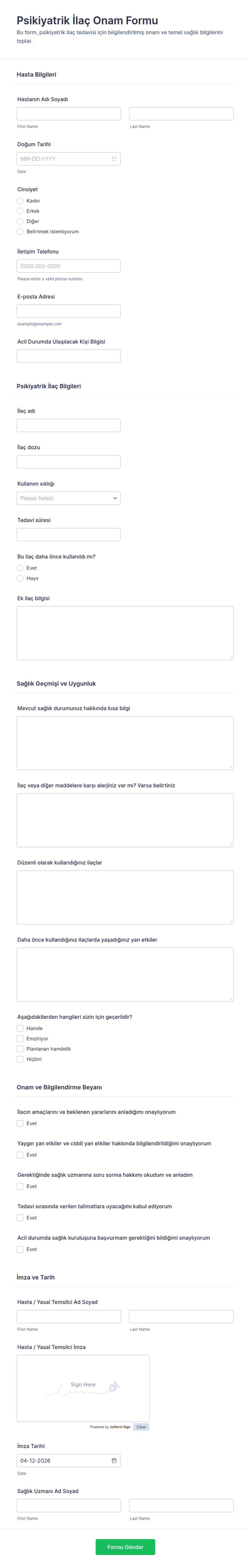Psikiyatrik İlaç Onam Formu ile psikiyatrik ilaç kullanımı için hasta veya yasal temsilci onayını dijital olarak toplayın, imzalı form yanıtlarını Jotform’da düzenli biçimde yönetin.