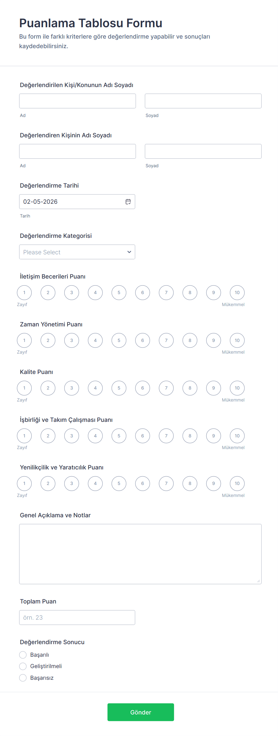 - Formunuzun amacını belirleyin (örn. çalışan değerlendirmesi, öğrenci gelişimi, proje takibi).