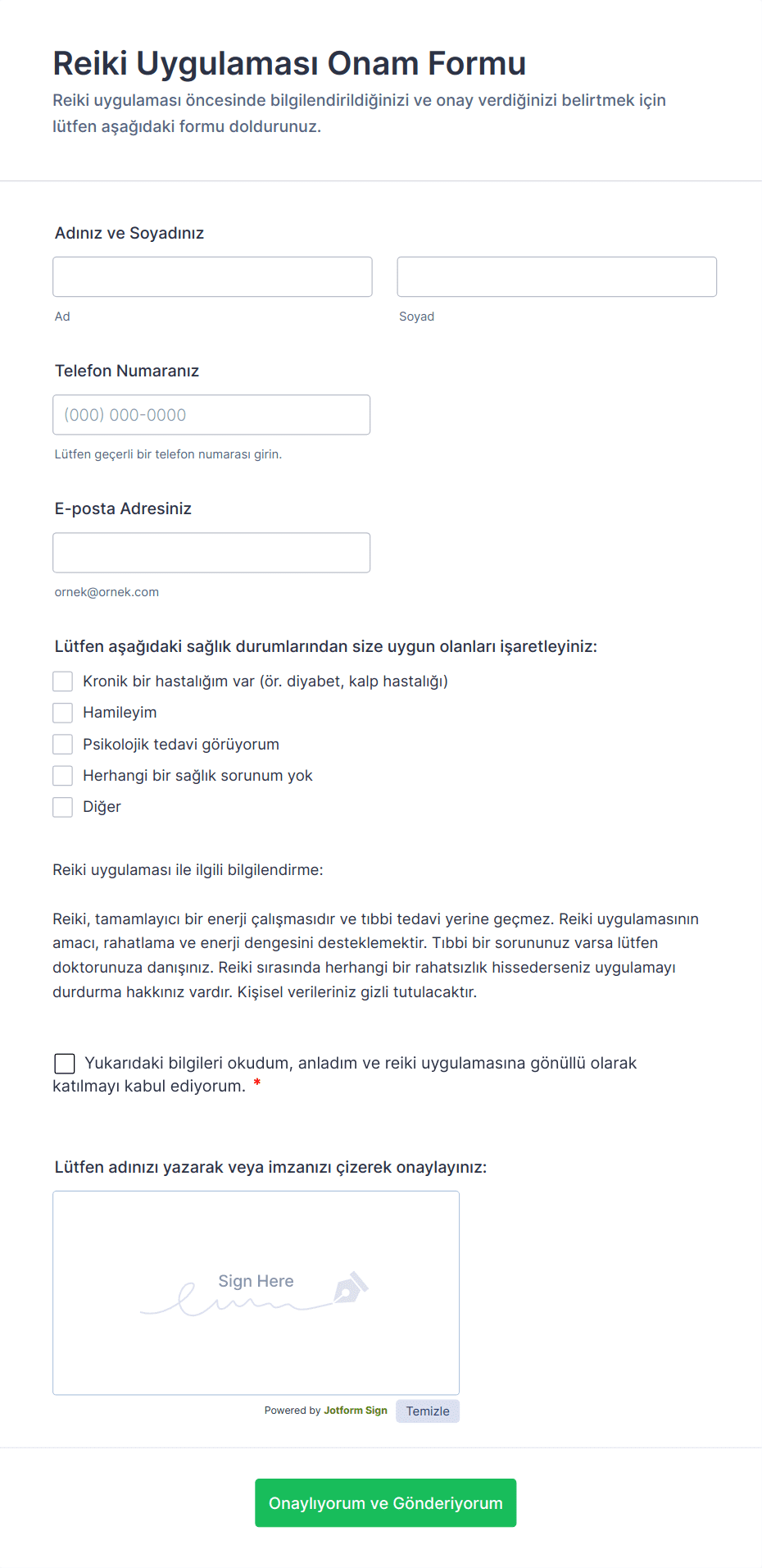 Jotform ile bilgilendirilmiş onam formlarını oluşturmak ve yönetmek sorunsuz ve verimli bir süreç haline gelir. Jotform'un kodlama gerektirmeyen Form Oluşturucu'su, kullanıcıların sağlık hizmetleri, araştırma veya iş amaçları için özel onam formlarını hızlıca tasarlamasına olanak tanır. Kullanıcılar, sürükle-bırak işlevselliğinden yararlanabilir, e-imza widget'larını entegre edebilir ve gerekli tüm bilgilerin alınmasını sağlamak için koşullu mantık kurabilir. Yanıtlar güvenli bir şekilde depolanır ve kolayca erişilebilir durumdadır, bu da uyumluluk ve kayıt tutma sürecini kolaylaştırır. Jotform'un kapsamlı şablon kütüphanesi ve entegrasyon seçenekleri süreci daha da basitleştirir ve kuruluşların onam verilerini profesyonel ve uyumlu bir şekilde toplamasını, yönetmesini ve korumasını kolaylaştırır.