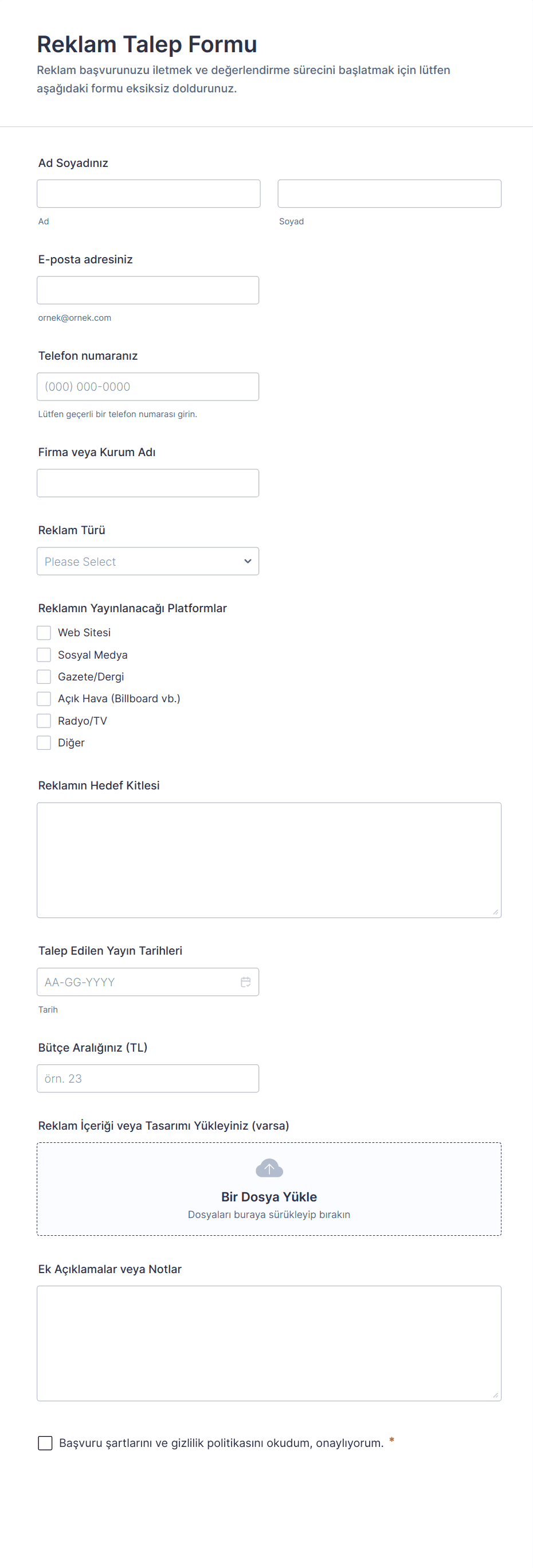 Reklam departmanları ve ajanslar şirket içerisinde veri toplamak ve müşteriler ilişkilerini güçlendirmek için çeşitli yollara başvurur. Yeni müşteri bilgilerini, proje gereksinimlerini, dosyaları, ödemeleri veya imzalanan sözleşmeleri daha verimli bir şekilde toplamanıza yardımcı olacak reklam formu şablonlarımıza hemen göz atın. Müşteri ilişkileri, muhasebe ya da tasarım ekipleriniz arasındaki iletişimi daha iyi organize edin. Jotform’un tamamen özelleştirilebilir reklam formu şablonları ile verimliliğinizi arttırın ve zamandan tasarruf edin.