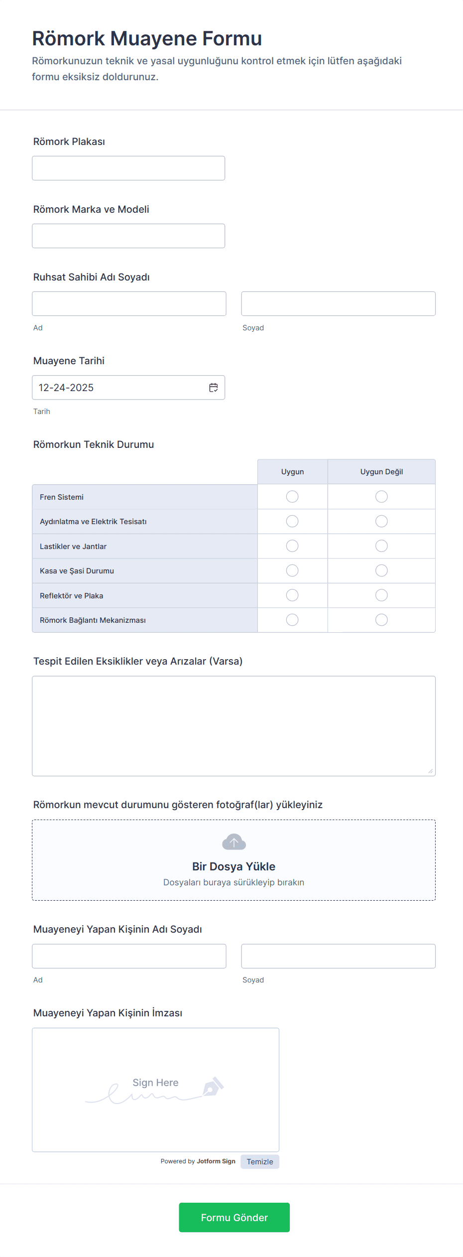 Jotform ile kullanıcılar, hiçbir kod yazmadan Araç Muayene Formlarını online olarak kolayca oluşturabilir, özelleştirebilir ve yönetebilir. Jotform'un kullanımı kolay sürükle-bırak Form Oluşturucu'sunu kullanan kullanıcılar, araç detayları, muayene kontrol listeleri, fotoğraflar, imzalar ve daha fazlası için alanlar ekleyebilir. Platformun kapsamlı şablon kütüphanesi ve entegrasyon seçenekleri, veri toplama sürecini kolaylaştırarak muayene sonuçlarını depolamayı, düzenlemeyi ve paylaşmayı basitleştirir. İster büyük bir filo yönetiyor olun ister ara sıra muayene yapıyor olun, Jotform'un özellikleri verimli, doğru ve erişilebilir araç muayene iş akışları sağlar.
