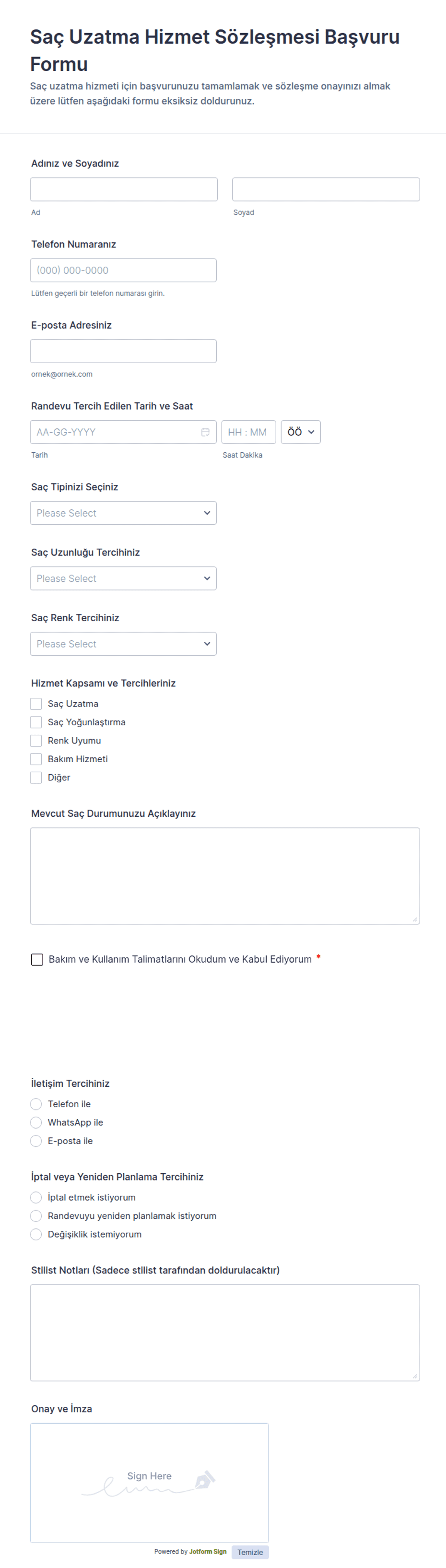 Bu form, saç uzatma hizmeti almak isteyen müşterilerin başvurularını toplamak, randevu talebini almak ve bakım talimatları ile hizmet koşullarına dair onayı tek akışta tamamlamak için kullanılır.