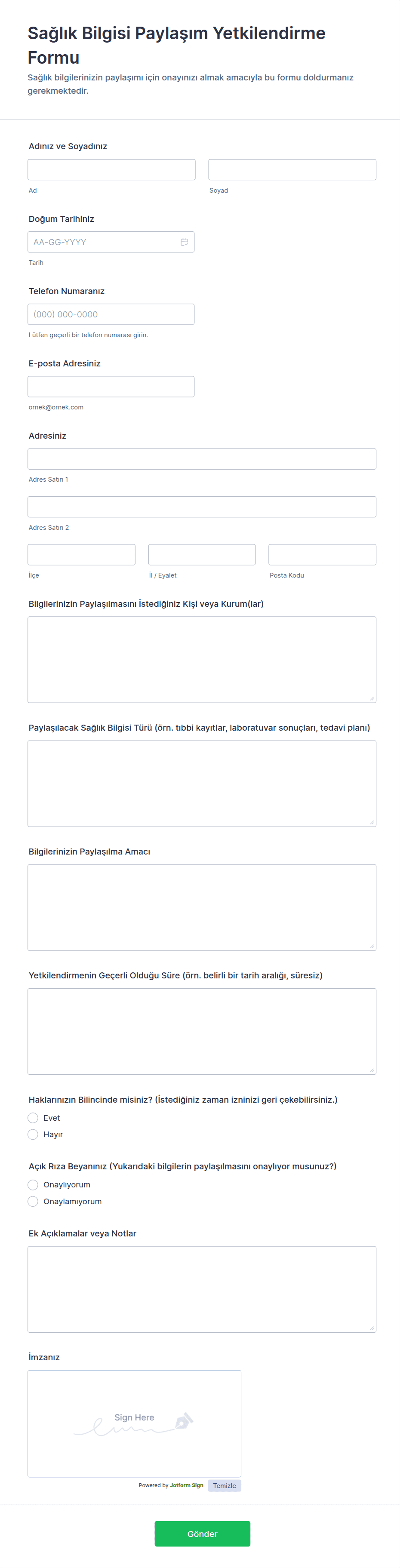 Jotform ile onay formları oluşturmak ve yönetmek sorunsuz bir süreç haline gelir. Jotform'un kodlama gerektirmeyen Form Oluşturucu'su, kullanıcıların hasta kabulü, ebeveyn izinleri veya veri işleme sözleşmeleri gibi özel ihtiyaçlarına yönelik onay formlarını hızlıca tasarlamalarına olanak tanır. Sürükle-bırak arayüzü, özelleştirilebilir şablonlar ve güvenli depolama ve bildirim sistemleriyle entegrasyon, onay yanıtlarını toplamayı, düzenlemeyi ve erişmeyi kolaylaştırır. Kullanıcılar, Jotform'un gelişmiş özelliklerini kullanarak uyumluluğu sağlayabilir, iş akışlarını düzenleyebilir ve hem kuruluşlar hem de yanıtlayanlar için profesyonel bir deneyim sunabilir.