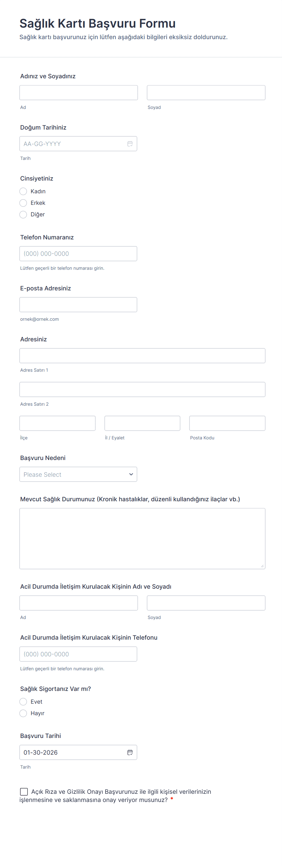 Medikal başvuru formları; sağlık hizmet sağlayıcıları, klinikler, hastaneler ve tıbbi kuruluşlar tarafından hastalardan, personelden veya başvuru sahiplerinden hayati bilgileri toplamak için kullanılan önemli araçlardır. Bu formlar, yeni hastalar için kayıt sürecini kolaylaştırır, tıbbi personel için iş başvurularını yönetir, gönüllü kayıtlarını düzenler ve sağlık sektöründeki çeşitli idari ihtiyaçları destekler. Tıbbi uygulama formları hasta kaydı, randevu talepleri, sigorta doğrulaması, tıbbi geçmiş toplama, personel işe alımı ve daha fazlası için kullanılabilir. Bu formlar, bilgilerin toplanma şeklini standartlaştırarak tıbbi iş akışlarında doğruluk, uyumluluk ve verimliliği sağlamaya yardımcı olur.