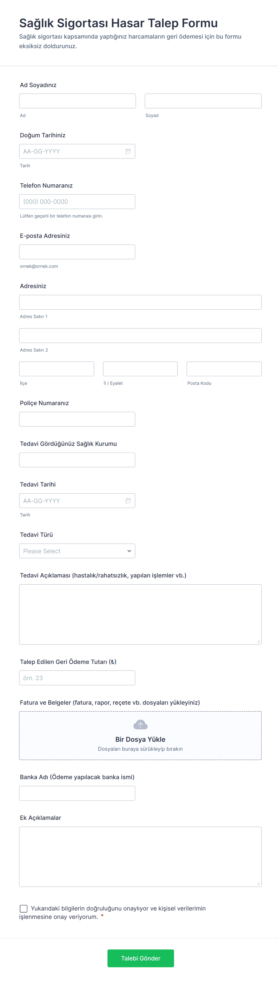Yaygın alanlar arasında poliçe sahibi bilgileri, olay açıklaması, olayın tarihi ve yeri, talep türü ve destekleyici belgeler bulunur.