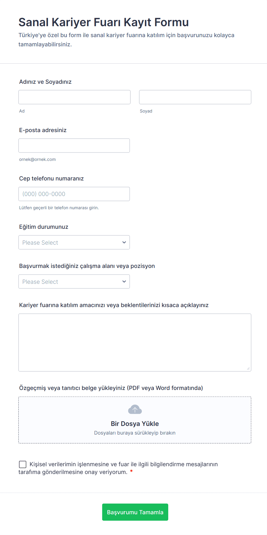 Sanal Etkinlik Formu, web seminerleri, online konferanslar ve dijital atölyeler gibi sanal etkinlikler için katılımcılardan, konuşmacılardan veya sponsorlardan bilgi toplamak amacıyla kullanılan bir online formdur.