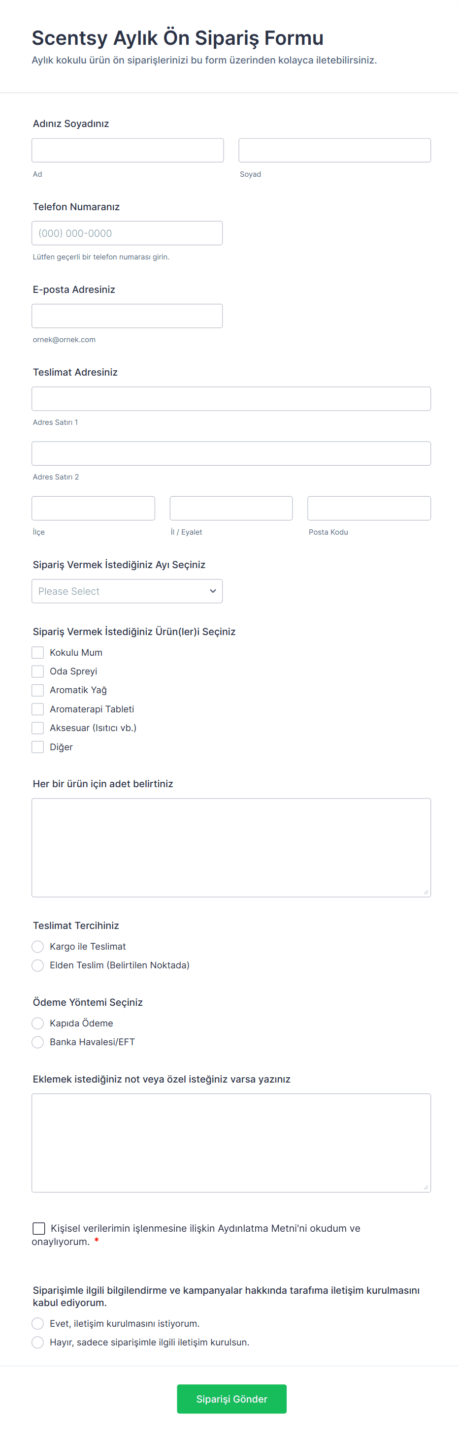 Temel alanlar arasında ürün detayları, miktar, müşteri iletişim bilgileri, ödeme seçenekleri, teslimat veya teslim alma tercihleri ve özel talimatlar bulunur.