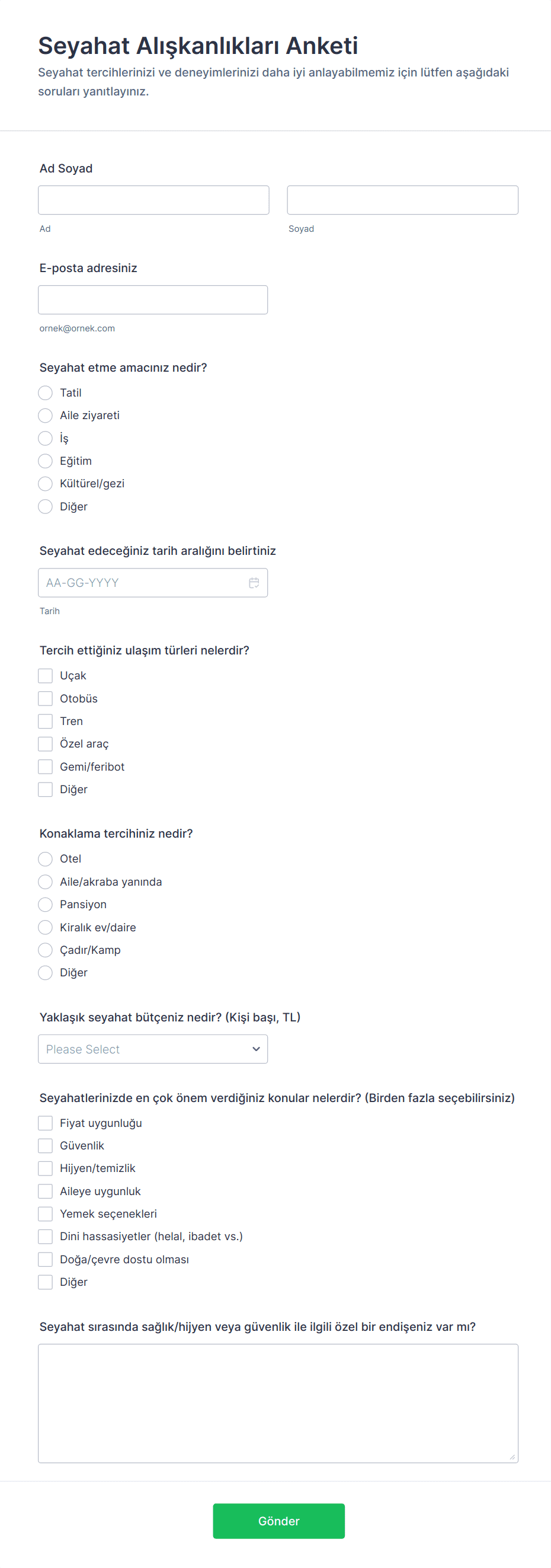 Temel alanlar: Ad, E-posta, Çoktan Seçmeli, Açılır Menü, Derecelendirme Ölçeği, Uzun Metin, vb.