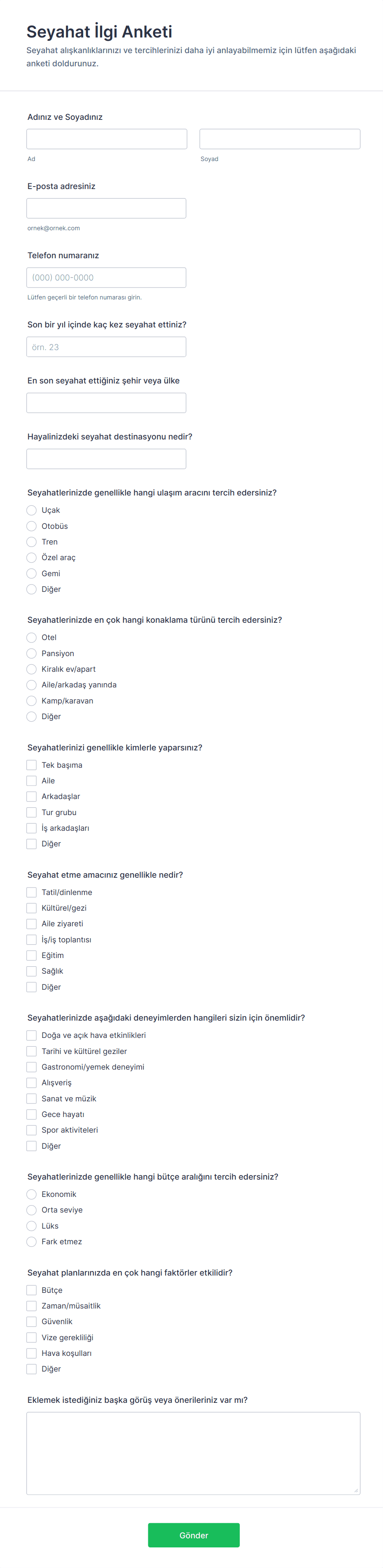 Seyahat Geri Bildirim Formları, gezginlerin seyahatleri, konaklamaları, turları veya genel seyahat hizmetleri hakkındaki görüşlerini, fikirlerini ve deneyimlerini toplamak için tasarlanmış özel araçlardır. Bu formlar, seyahat acenteleri, tur operatörleri, oteller, havayolları ve etkinlik organizatörleri tarafından bir seyahat veya seyahat ile ilgili hizmet sonrasında müşterilerinden değerli geri bildirimler toplamak için yaygın olarak kullanılır. Toplanan bilgiler, memnuniyet değerlendirmelerinden iyileştirme önerilerine ve seyahat deneyiminin belirli yönleri hakkında detaylı yorumlara kadar uzanabilir. Kullanım alanları arasında seyahat sonrası anketler, otel konaklaması değerlendirmeleri, tur rehberi değerlendirmeleri, ulaşım geri bildirimleri ve etkinliğe katılım değerlendirmeleri yer alır ve tümü hizmet kalitesini ve müşteri memnuniyetini artırmayı hedefler.