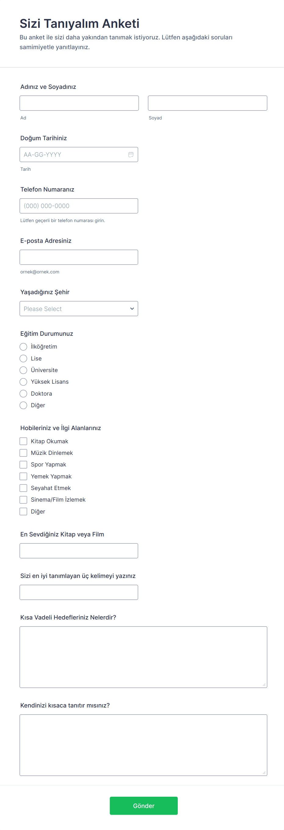 - Akademik araştırmalar için Likert ölçekleri ve demografik soruları kullanın.