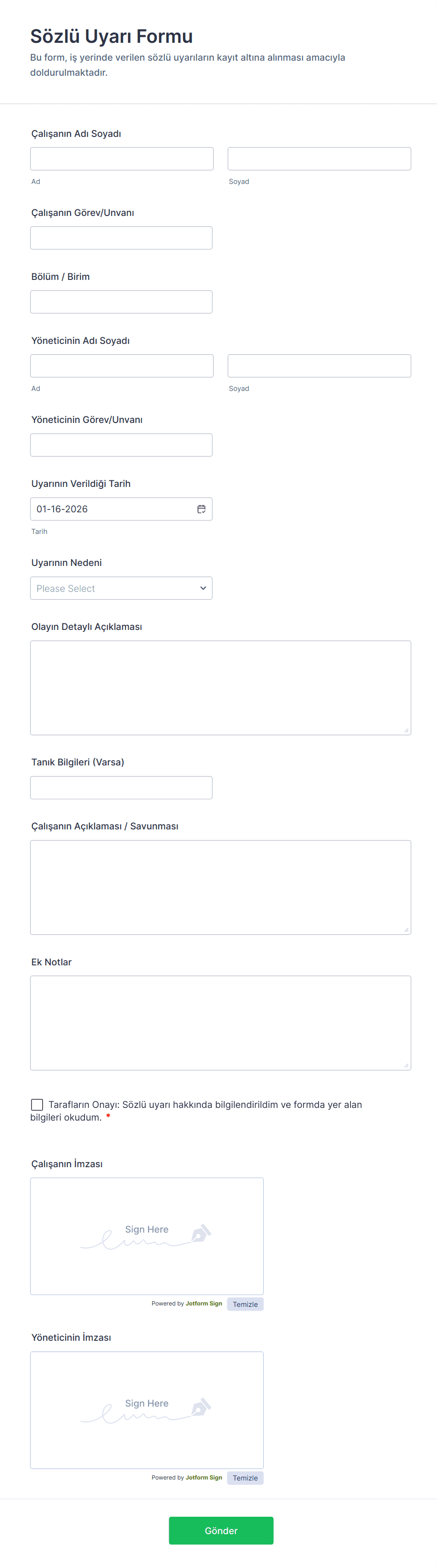Disiplin formları işverenler veya İK departmanları tarafından şikayetlerin, uyarıların veya disiplin cezalarının raporlanması için kullanılır. Jotform'un bu hazır form şablonlarını kullanarak, şirketiniz dağınık kağıt formlardan, herhangi bir cihazda doldurulabilen ve Jotform hesabınızda güvenli bir şekilde saklanabilen güçlü online disiplin formlarına geçiş yapabilir.