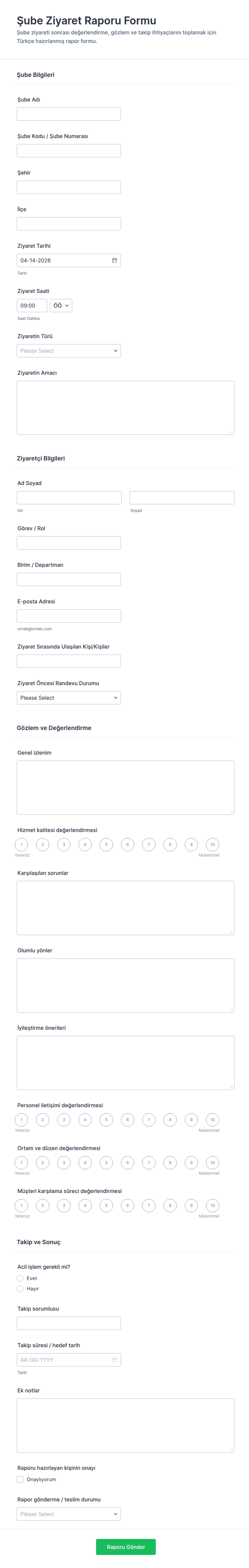 Şube Ziyaret Raporu Formu, şube denetimlerinde ziyaret bilgilerini, gözlem değerlendirmelerini ve takip adımlarını düzenli biçimde toplamak isteyen saha ekipleri ve yöneticiler için idealdir.