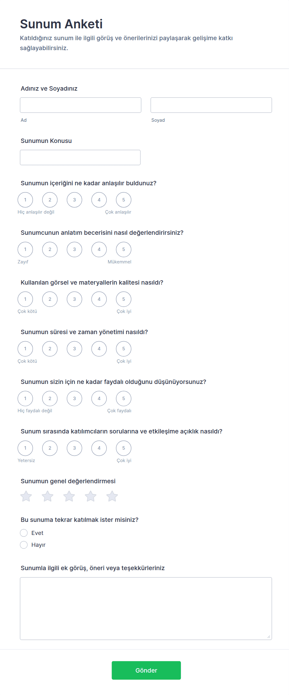 Bu adımları takip ederek, etkinliklerinizi sürekli olarak iyileştirmeniz ve katılımcı memnuniyetini artırmanız için ihtiyacınız olan bilgileri toplayan özelleştirilmiş bir Etkinlik Geri Bildirim Formu oluşturabilirsiniz.