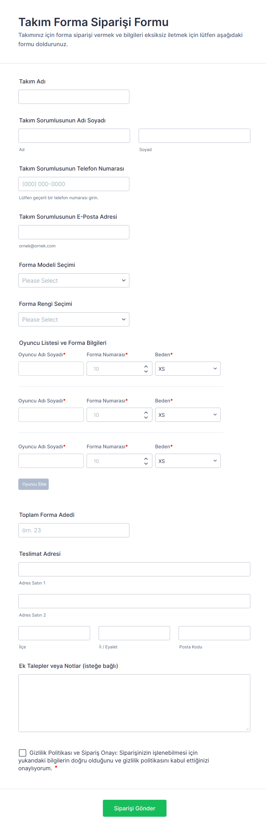- Takım Forması Siparişleri: Spor takımları için oyuncu bilgilerini, beden ölçülerini ve özelleştirme detaylarını toplayın.