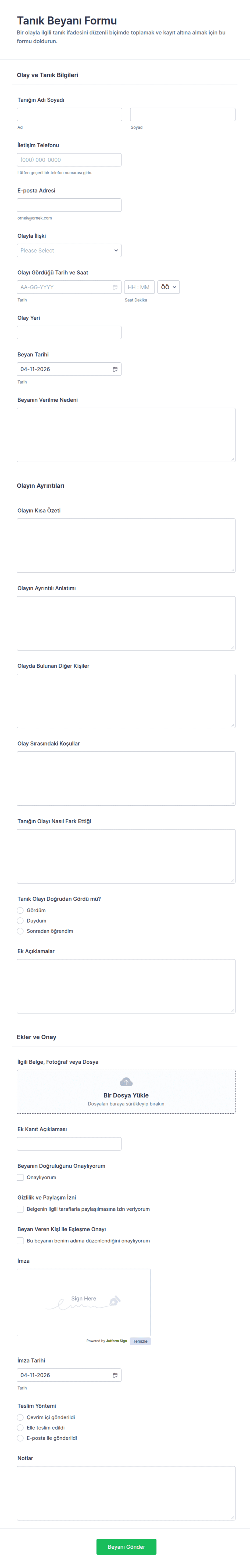 Tanık Beyanı Formu, olaylara ilişkin tanık anlatımlarını online olarak toplayıp düzenli şekilde arşivlemek isteyen kurumlar ve işletmeler için pratik bir form şablonu sunar.