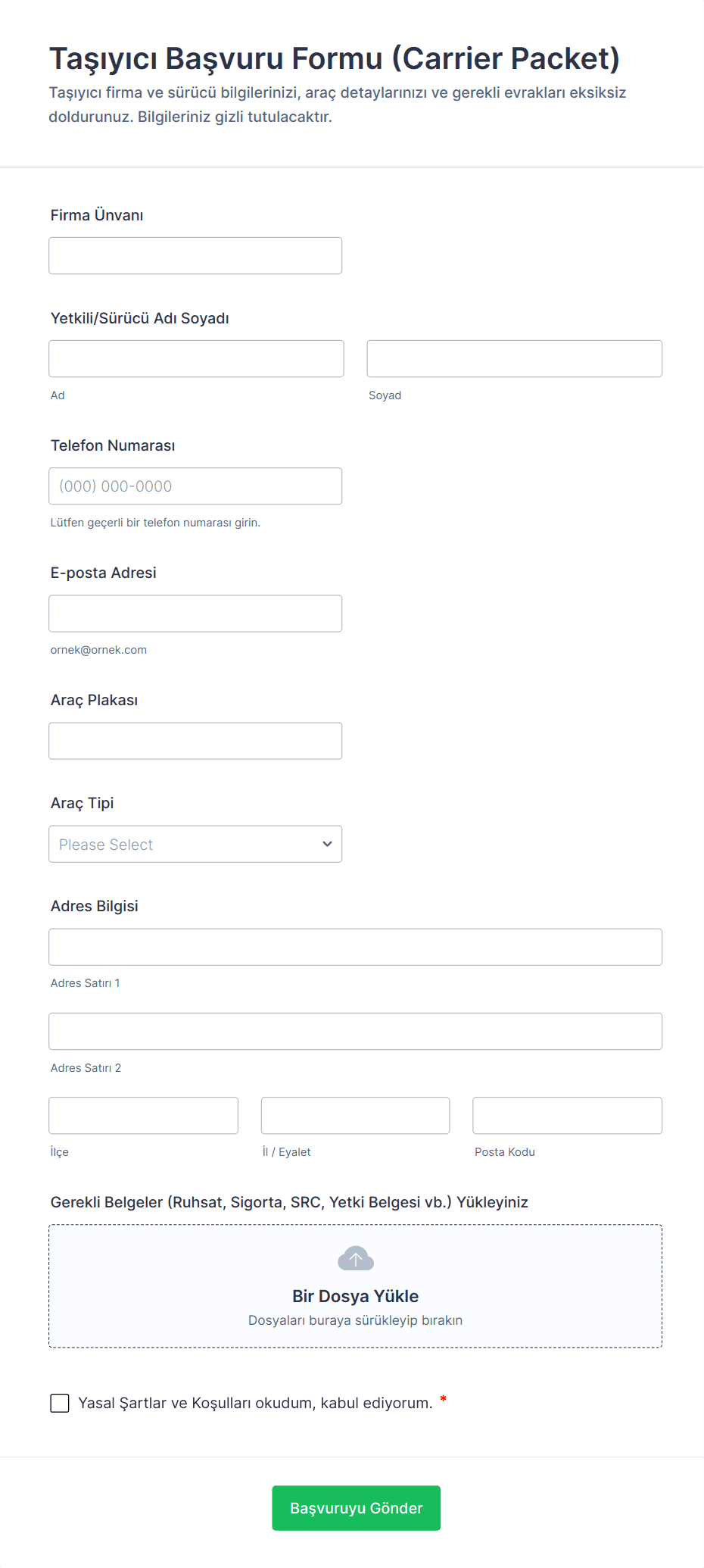 Taşıyıcı Başvuru Formu (Carrier Packet), nakliye ve lojistik firmalarının yeni taşıyıcıları, alt yüklenicileri ve sürücüleri çevrimiçi olarak başvuru sürecine dahil etmek ve gerekli firma, araç ve iletişim bilgilerini tek noktadan toplamak için kullanılır.