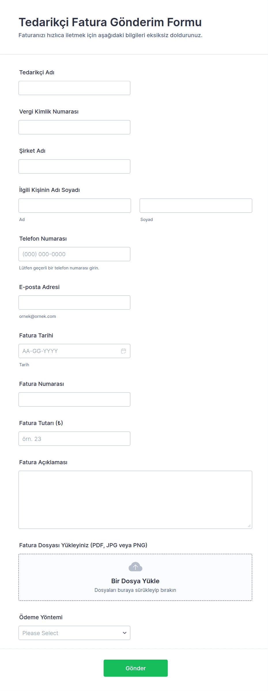 - Tedarikçi işe alım ve kayıt formları şirket detaylarına, ürün veya hizmet kategorilerine, iletişim bilgilerine, bankacılık ve vergi bilgilerine ve gerekli belge yüklemelerine odaklanır.
