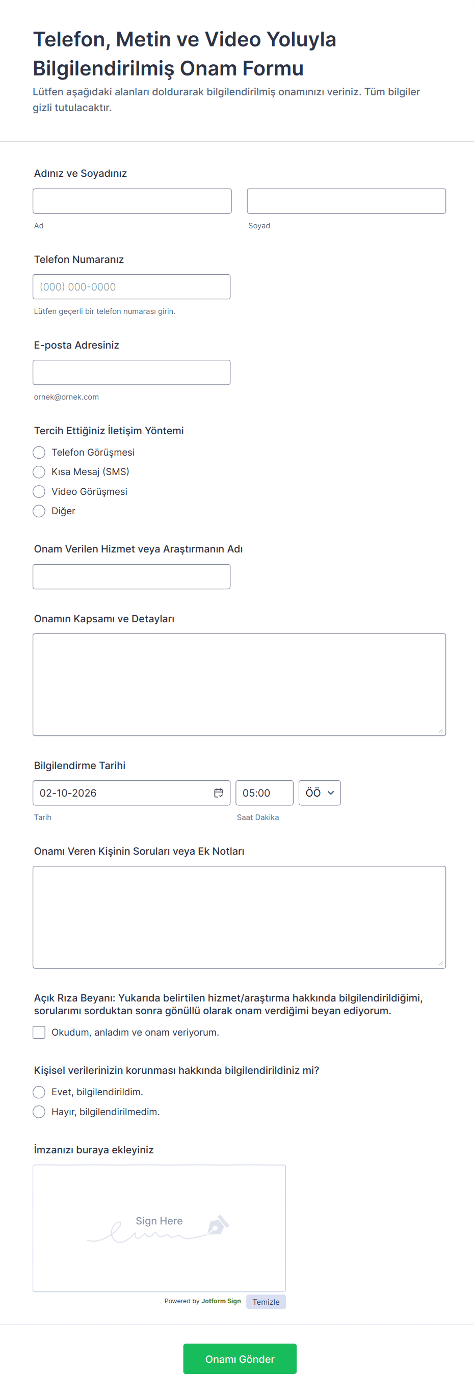 Bilgilendirilmiş onam formları, bireylerin belirli bir faaliyete, prosedüre veya araştırma çalışmasına katılmayı anladıklarından ve gönüllü olarak kabul ettiklerinden emin olmak için kullanılan önemli belgelerdir. Bu formlar yaygın olarak sağlık hizmetlerinde, klinik deneylerde, akademik araştırmalarda, danışmanlıkta ve hatta hassas verilerin toplandığı veya prosedürlerin gerçekleştirildiği eğitim veya iş ortamlarında kullanılır. Bilgilendirilmiş onam formunun temel amacı, önerilen bir eylemin niteliğini, risklerini, faydalarını ve alternatiflerini açıkça ileterek katılımcıların bilinçli kararlar vermelerini sağlamaktır. Kullanım alanları tıbbi tedavilerden psikolojik değerlendirmelere, fotoğraf izinlerinden etkinlik katılımına ve araştırma için veri toplamaya kadar uzanır.