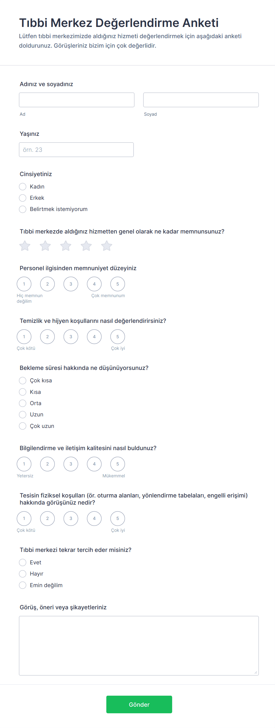 - Personel etkileşimi, tesis temizliği, bekleme süreleri veya tedavinin yeterliliği gibi değerlendirmek istediğiniz temel alanları belirleyin.