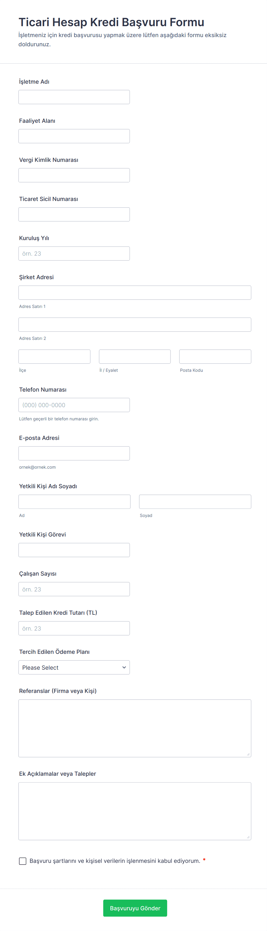 - İş kredisi formları genellikle işletme finansalları, vergi belgeleri ve iş planları gerektirir