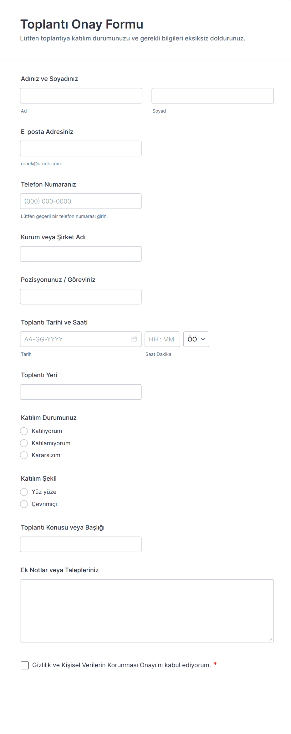 Toplantı Onay Formu, toplantı katılımını ve katılım şeklini tek bir link üzerinden toplayarak kurum içi ve kurumlar arası görüşmelerde planlamayı kolaylaştırır ve Jotform ile veri toplama sürecini düzenler.