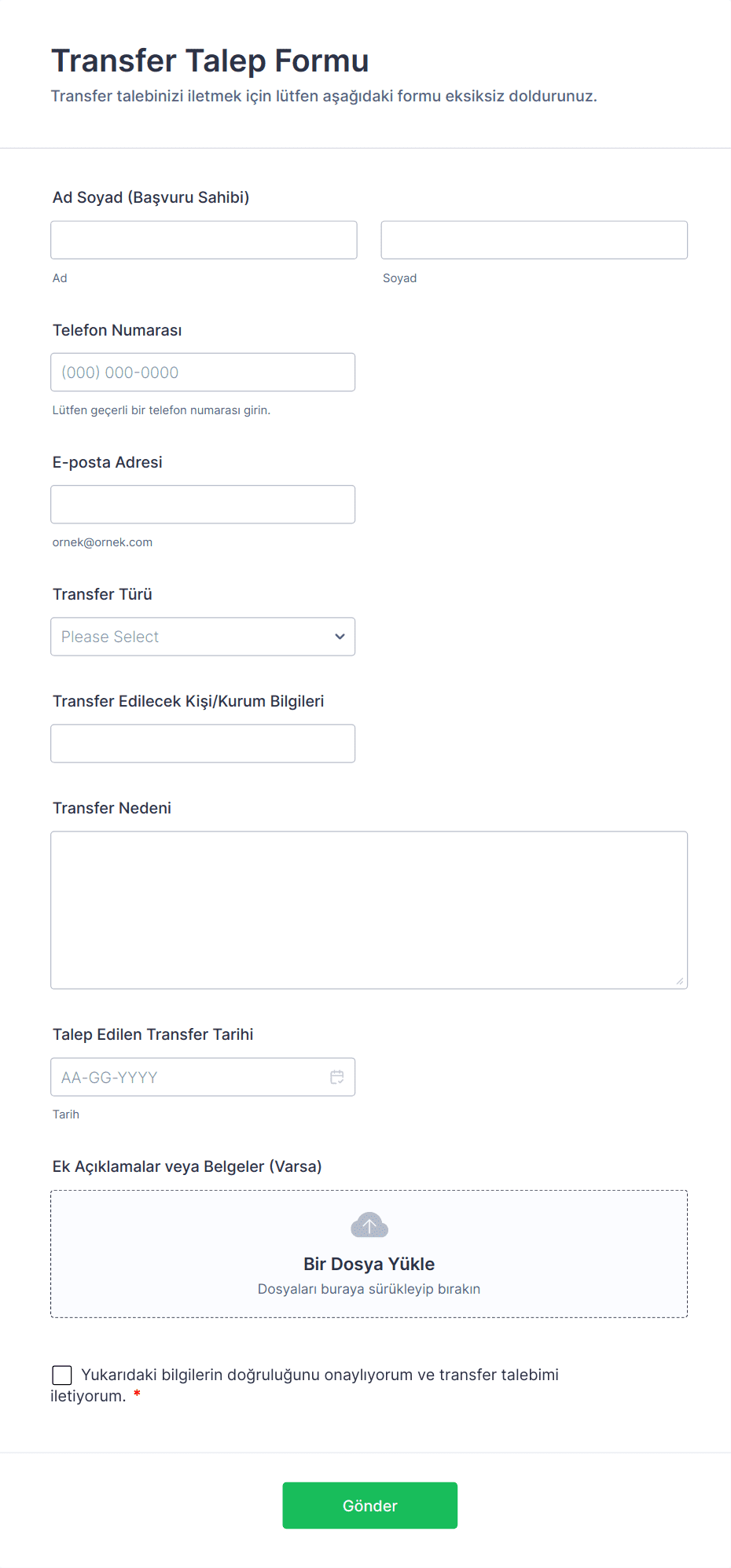 Transfer Talep Formu, kişi ve kurumların para, hak veya hesap devri gibi transfer taleplerini çevrimiçi toplayıp organize etmek isteyen finans, idari işler ve benzeri ekipler için hazırlanmış bir form şablonudur.
