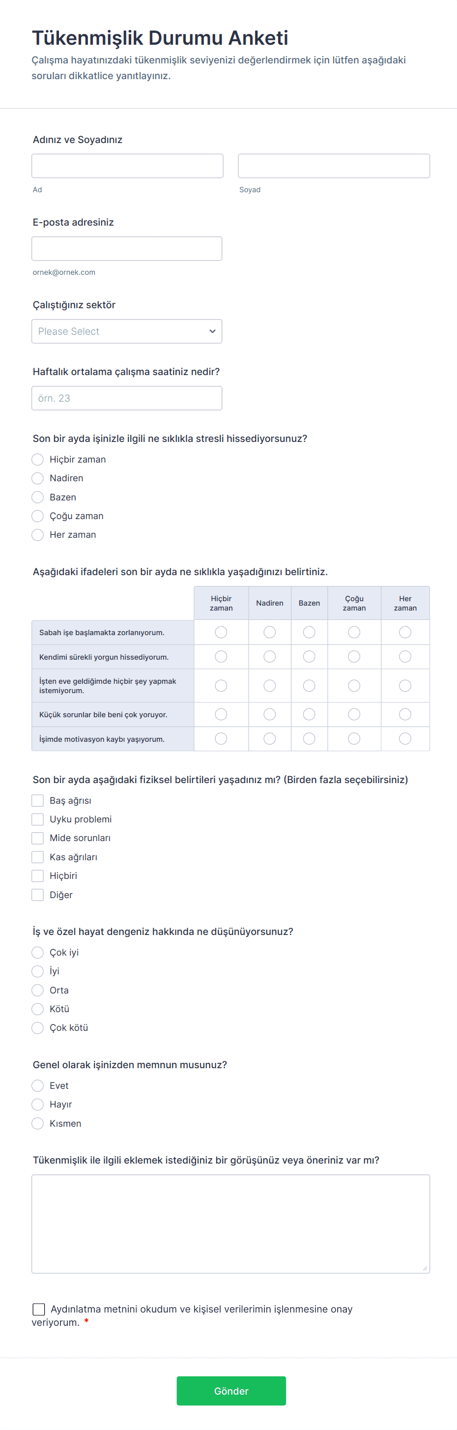 Tükenmişlik Durumu Anketi Formu, çalışan stresini ve iş yaşam dengesini düzenli olarak ölçmek isteyen insan kaynakları ekipleri ve yöneticiler için veri toplama sürecini Jotform ile kolaylaştırır.