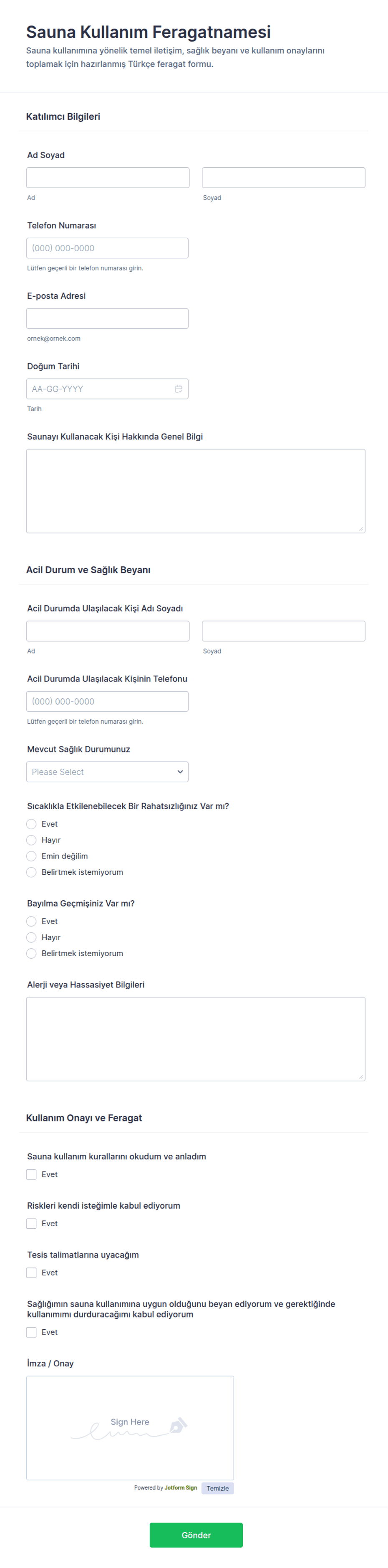 Sauna Kullanım Feragatnamesi Formu, spa, otel ve spor salonlarının sauna kullanımı öncesinde onay ve imza almasına, sağlık beyanlarını düzenli veri toplama ile kayıt altında tutmasına yardımcı olur.