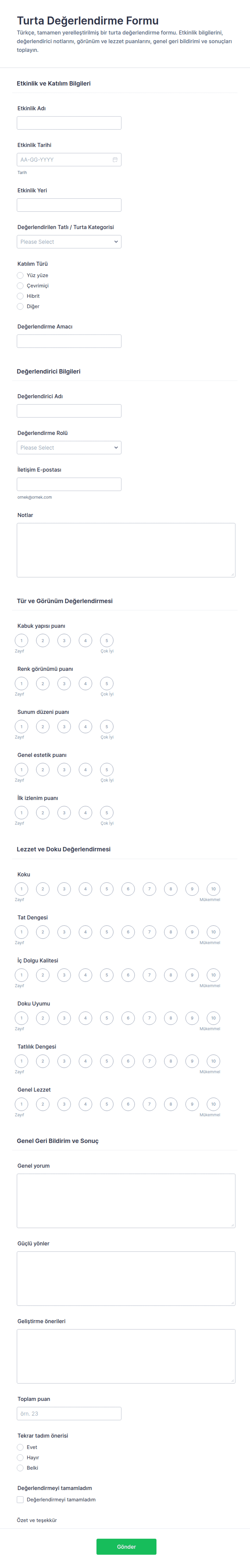 - İçerik ve alanlar etkinlik türüne göre değişiklik gösterebilir; örneğin, bir konferans geri bildirim formu oturum değerlendirmelerini içerebilirken, sosyal etkinlik formu yemek, eğlence ve atmosfer üzerine odaklanabilir.