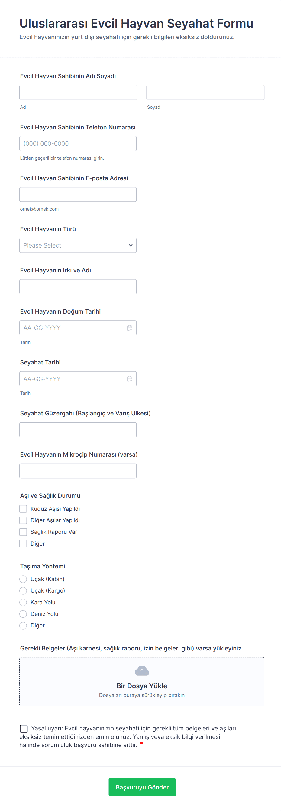Seyahat rezervasyon formu, uçuşlar, oteller, turlar veya ulaşım gibi seyahat hizmetlerini rezerve etmek isteyen müşterilerden bilgi toplamak için kullanılan bir online formdur. Tüm gerekli detayları tek bir yerde toplayarak rezervasyon sürecini kolaylaştırır.