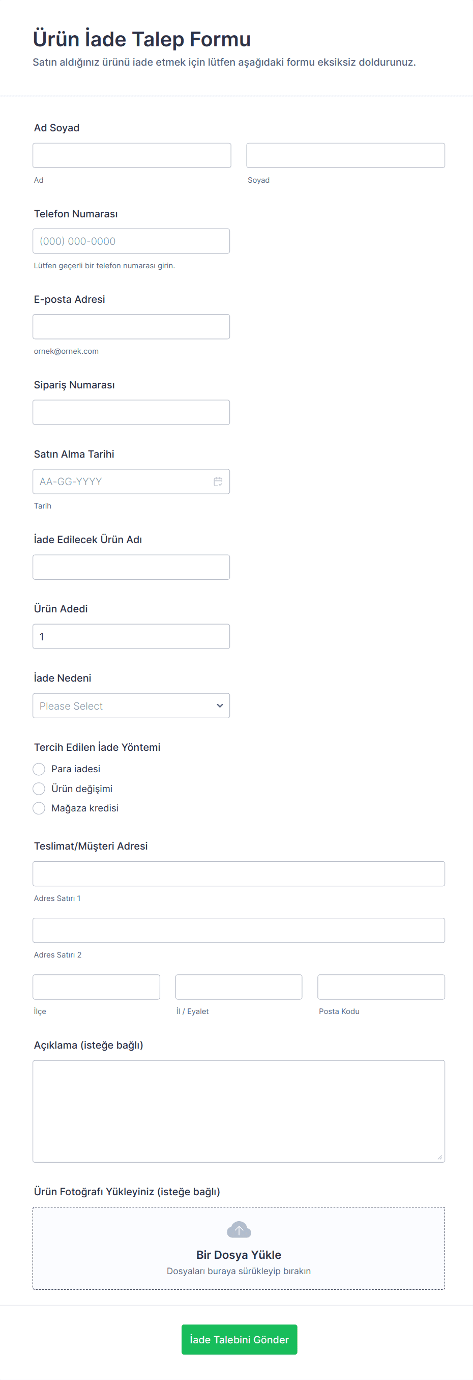 - E-ticaret İadeleri: Sipariş numarası, ürün detayları, iade nedeni ve fatura veya fotoğraflar için yükleme alanları gerektirebilir.