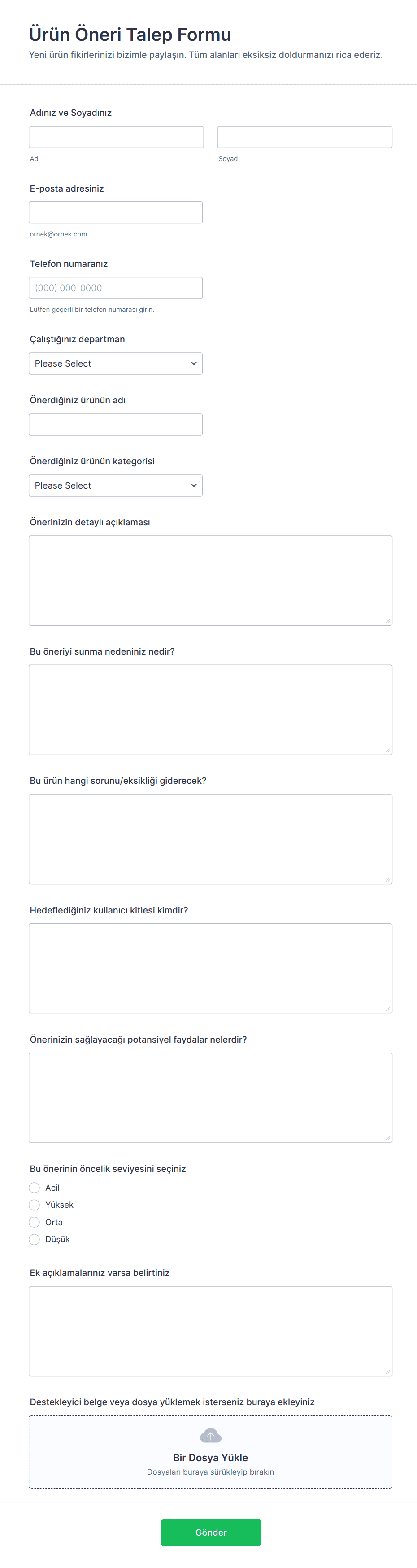 Talep formları, birinin bir şey talep etmesi gerektiğinde bilgi toplama ve düzenleme için gerekli araçlardır — bu bir hizmet, kaynak, onay veya destek olabilir. Bu formlar, ekipman talepleri, bakım talepleri, izin talepleri, BT desteği, satın alma siparişleri, tesis rezervasyonları ve daha fazlası gibi çeşitli senaryolarda taleplerin gönderilmesini ve yönetilmesini kolaylaştırır. Tüm gerekli bilgileri toplamak için standart bir yol sağlayarak, talep formları organizasyonların her talebin net, izlenebilir ve harekete geçirilebilir olmasını sağlamasına yardımcı olur, yanlış anlaşılmaları ve gecikmeleri azaltır.
