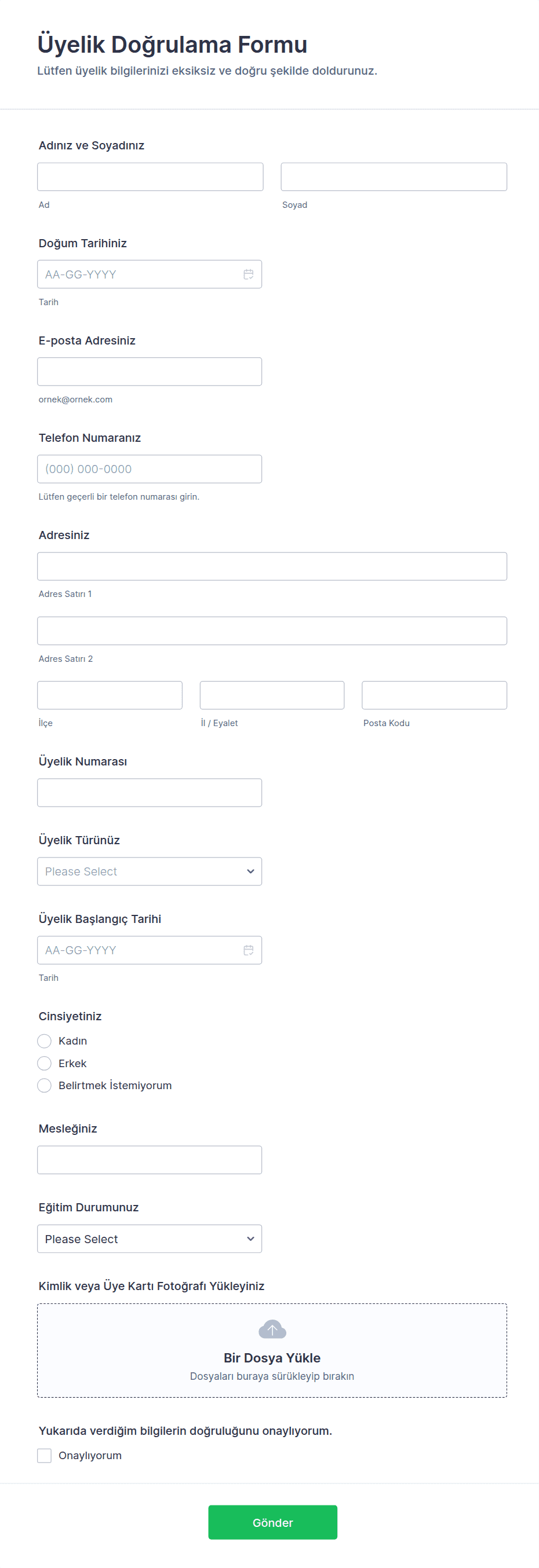 Üyelik Doğrulama Formu, kurumların mevcut üyelik bilgilerini çevrim içi veri toplama ile doğrulamasına ve kayıtlarını güncel tutmasına yardımcı olan bir form şablonudur.